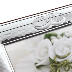 DETALII: Finisaj argintiu lucios, profil embosat, decor 3D în formă de număr 50 și verighete