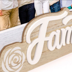 Designul său din lemn alb, cu mesajul "Familia" în relief, se potrivește perfect în orice casă.