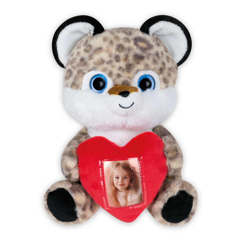 • Design: Leopardul are o blană moale din pluș cu model specific (pete de leopard), ochi albaștri mari și o inimă roșie integrată pe care o ține în labe.